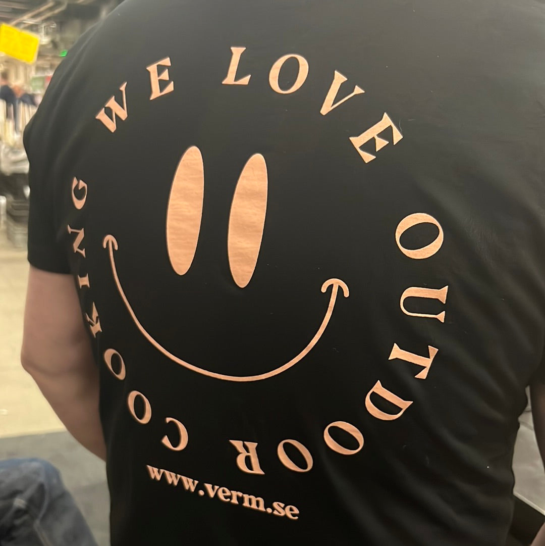 Verm-logotyp på bröstet och trycket "We love outdoor cooking" på ryggen.